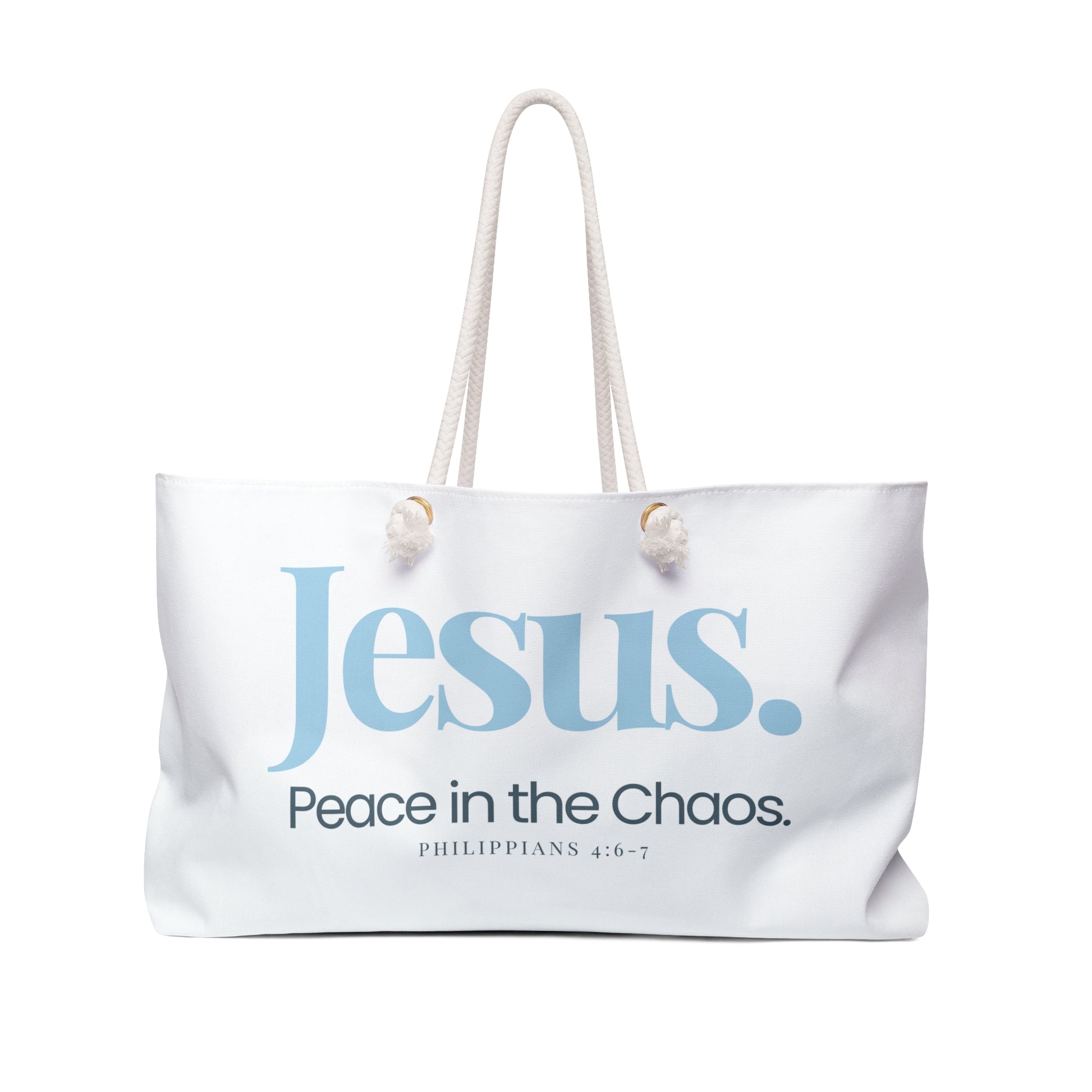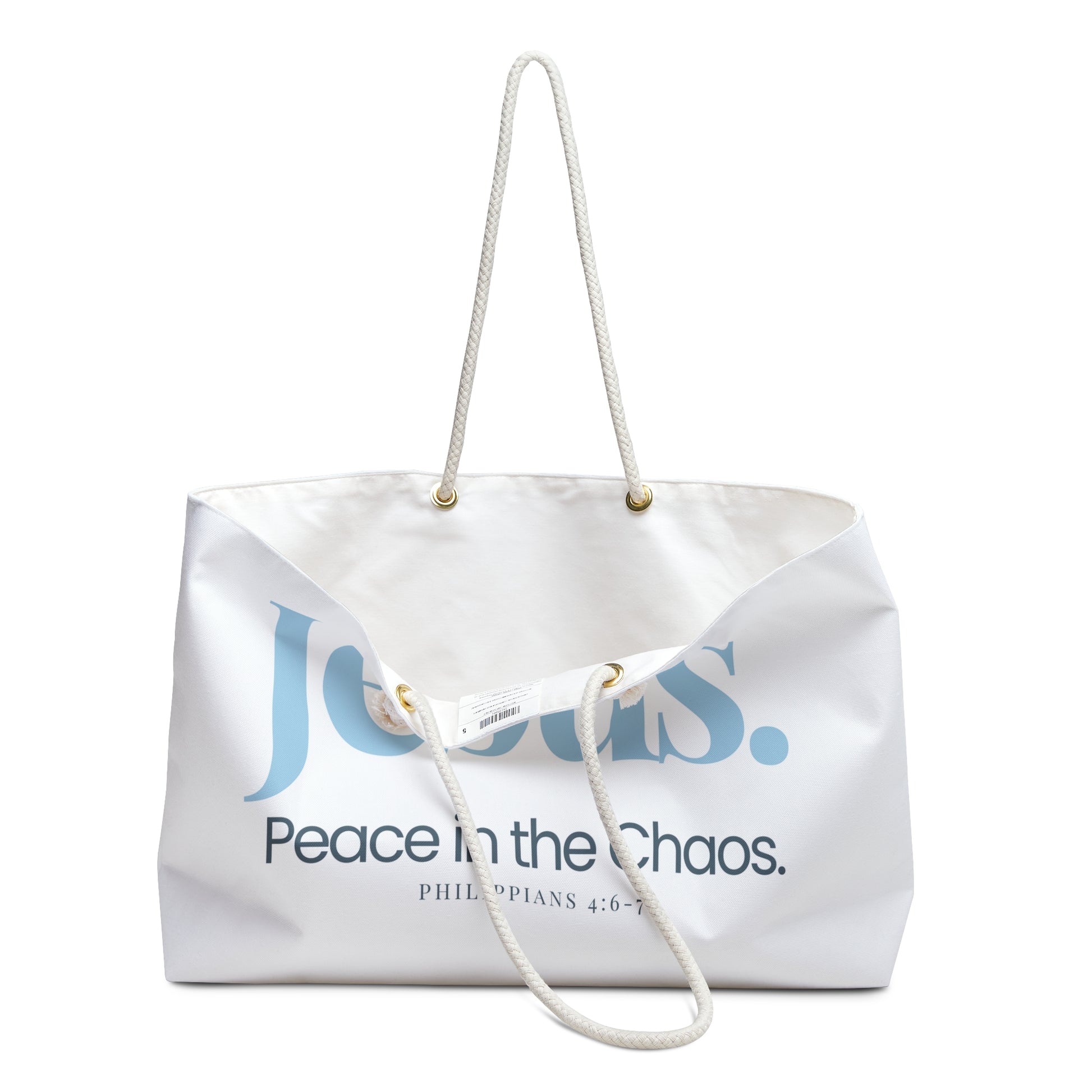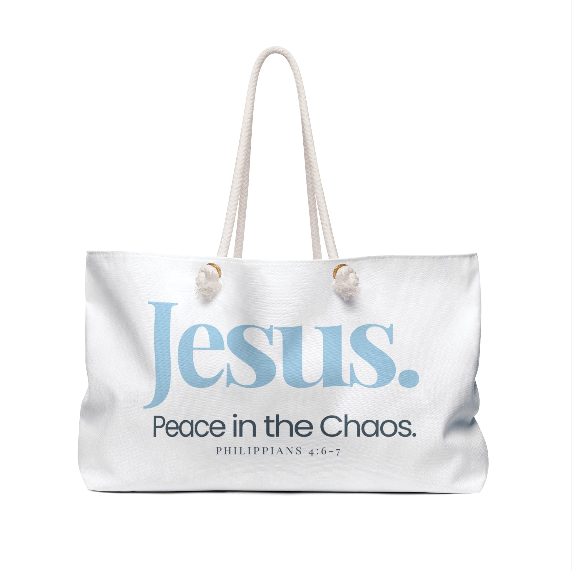 Oh how fun is this oversized Weekender Tote? It is perfect for your weekend at the beach or in town. The wide-mouthed, durable bag holds a generous amount of personal items and is easily held by its thick rope handles. ✝️Jesus Peace in the Chaos...Have you ever sat in the midst of utter chaos? Let me encourage you that within a life of prayer, Jesus offers Peace within that chaos. Taken from Philippians 4:6-7, these beautiful items serve as a reminder to not stay in a position of anxiousness but rather a position of Thankful Prayer and acceptance of His Peace within the chaos and His Calm within our life Storms. Such A Powerful statement that in All things Jesus offers Peace in the Chaos, especially within the times we live in, we must Shine a way back to HIM.
